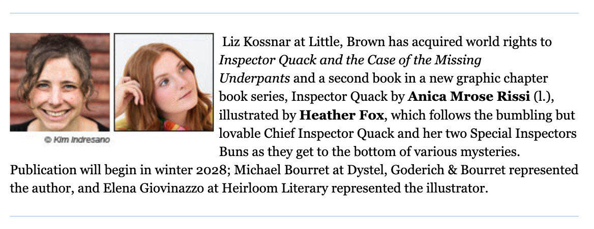 Liz Kossnar at Little, Brown has acquired world rights to Inspector Quack and the Case of the Missing Underpants and a second book in a new graphic chapter book series, Inspector Quack by Anica Mrose Rissi (l.), illustrated by Heather Fox, which follows the bumbling but lovable Chief Inspector Quack and her two Special Inspector Buns as they get to the bottom of various mysteries. Publication will begin in winter 2028; Michael Bourret at Dystel, Goderich & Bourret represented the author, and Elena Giovinazzo at Heirloom Literary represented the illustrator.